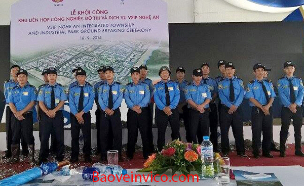 Công ty dịch vụ bảo vệ INVICO tham gia bảo vệ lễ khởi công Khu liên hợp công nghiệp, đô thị và dịch vụ VSIP Nghệ An năm 2015. Ảnh INVICO cung cấp.