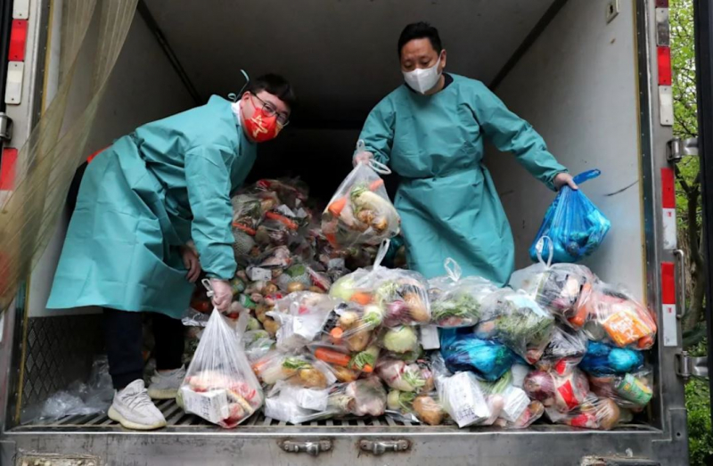 Các nhân viên điều phối phân phát thực phẩm cho cư dân Thượng Hải. Ảnh: Reuters