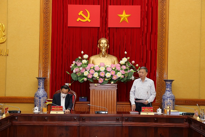 Thay mặt Đảng ủy Công an Trung ương, lãnh đạo Bộ Công an, Bộ trưởng Tô Lâm trân trọng cảm ơn sự động viên, đánh giá của Thành ủy Hồ Chí Minh đối với công tác phòng, chống dịch của Bộ Công an và sự quan tâm, hỗ trợ, tạo điều kiện của các đồng chí trong Thành ủy, Ủy ban nhân dân, các cơ quan, sở, ngành của Thành phố Hồ Chí Minh đối với lực lượng Công an nhân dân trong thời gian qua. Bộ trưởng Tô Lâm khẳng định, lực lượng Công an nhân dân sẽ tiếp tục quán triệt, cụ thể hóa chỉ đạo của Trung ương Đảng, Quốc hội, Chính phủ, Thủ tướng Chính phủ để tổ chức thực hiện công tác công an bảo đảm an ninh, trật tự, đấu tranh phòng, chống tội phạm trong điều kiện thích ứng an toàn, kiểm soát dịch Covid-19 trong tình hình mới; phối hợp thực hiện an dân, an sinh xã hội, phục vụ phục hồi và phát triển toàn diện các mặt đời sống xã hội, kinh tế, văn hóa, giáo dục...