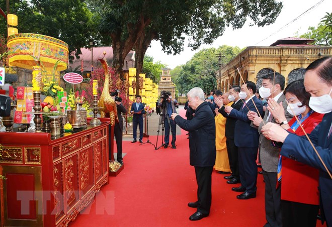Trong không khí ấm áp đầu Xuân, Tổng Bí thư, Chủ tịch nước Nguyễn Phú Trọng cùng các đại biểu đã thành kính dâng hương, cẩn cáo trước anh linh các vị liệt tổ, liệt tông về những thành quả xây dựng, phát triển đất nước; nguyện quyết tâm phát huy truyền thống văn hiến, anh hùng của Thăng Long-Hà Nội và những giá trị cao quý của dân tộc; vun đắp khối đại đoàn kết toàn dân, xây dựng đất nước ngày càng giàu mạnh, dân chủ, công bằng, văn minh.