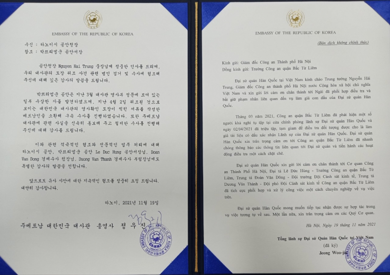 Thư cảm ơn của Đại sứ quán Hàn Quốc đối với Công an quận Bắc Từ Liêm