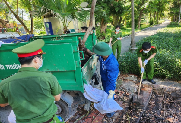 CBCS Phòng Cảnh sát Môi trường phối hợp cùng nhân viên Công ty môi trường đô thị Hà Đông dọn dẹp cảnh quan khu vực bờ sông Nhuệ, đoạn Cầu Trắng, Hà Đông