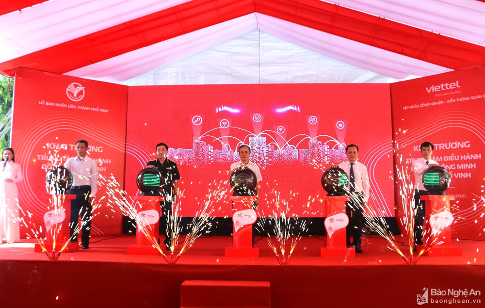 Lãnh đạo TP. Vinh, Tập đoàn Viettel và Sở Thông tin và Truyền thông bấm nút khai trương Trung tâm Điều hành đô thị thông minh TP . Vinh. Ảnh: Nguyễn Hải