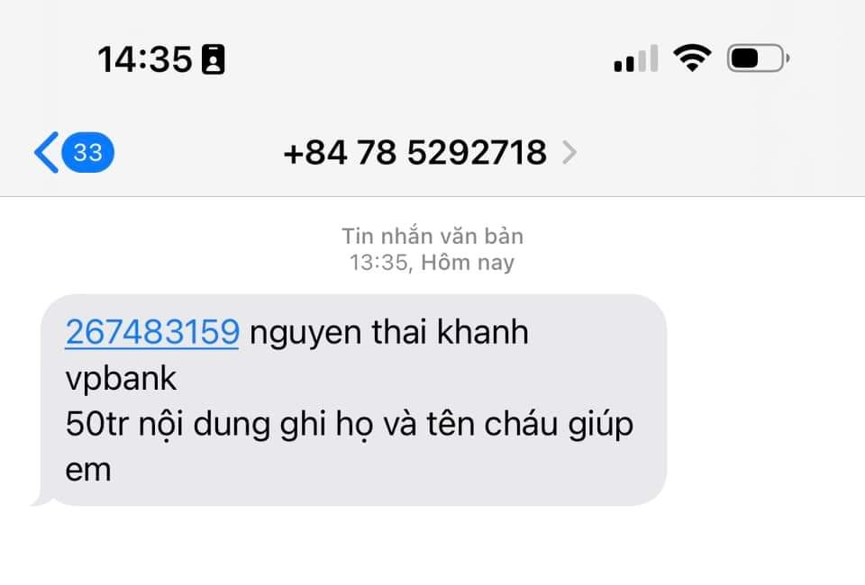 Đối tượng này thông báo con chị V. đang nhập viện cấp cứu do bị chấn thương sọ não tại Bệnh viện Xuyên Á (huyện Củ Chi, TP.HCM), yêu cầu gia đình chuyển gấp số tiền 50 triệu đồng để làm thủ tục cho cháu nhập viện. Đối tượng còn nêu rõ tên con, lớp học và trường học khiến phụ huynh vô cùng lo lắng.