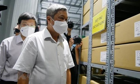 Thứ trưởng Bộ Y tế Nguyễn Trường Sơn kiểm tra công tác bảo quản vaccine phòng COVID-19 tại Công ty dược mỹ phẩm May. (Ảnh: TTXVN)