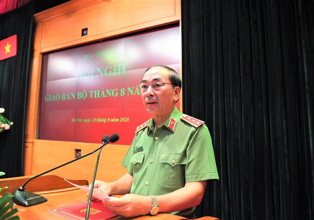 Chiều 28/8/2023, tại Hà Nội, Bộ Công an tổ chức Hội nghị giao ban đánh giá tình hình, kết quả công tác tháng 8/2023, triển khai các nhiệm vụ trọng tâm công tác tháng 9/2023. Đại tướng Tô Lâm, Ủy viên Bộ Chính trị, Bí thư Đảng ủy Công an Trung ương, Bộ trưởng Bộ Công an chủ trì Hội nghị.