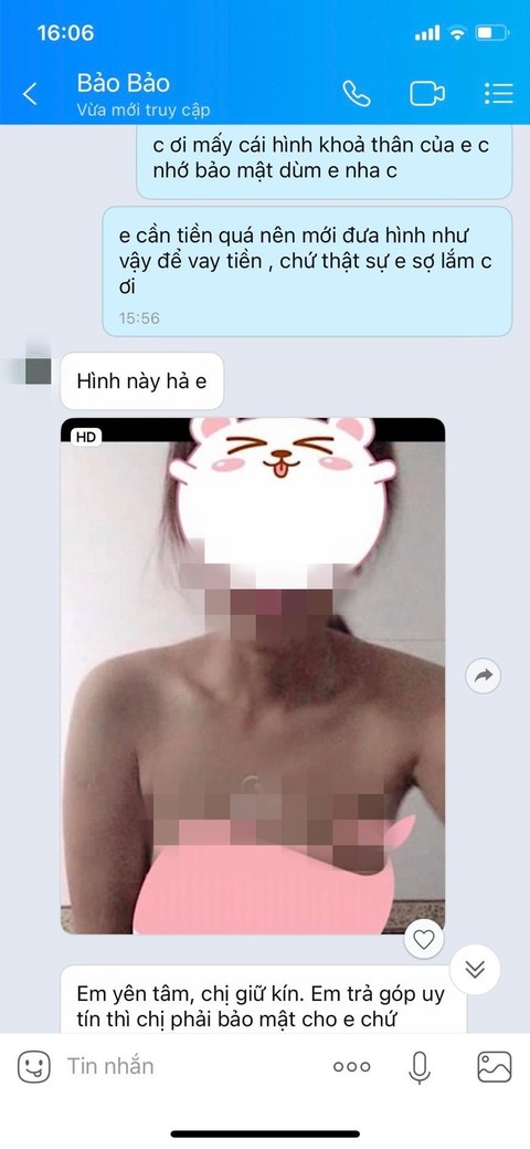 Ngọc đương nhiên không thể thoát được chiêu bài của bọn cho vay quá dày dạn kinh nghiệm. Để hoàn thành “giao dịch”, Ngọc phải đưa cho chủ nợ Giấy CMND (bản gốc) của cô, đồng thời ký tên vào giấy mượn nợ (nội dung không thể hiện lãi suất). Nhưng quan trọng nhất, đúng như thoả thuận trước đó, cô gái phải gửi hình khoả thân vào một tài khoản Zalo có tên “Bảo Bảo”, theo hướng dẫn của Toàn.