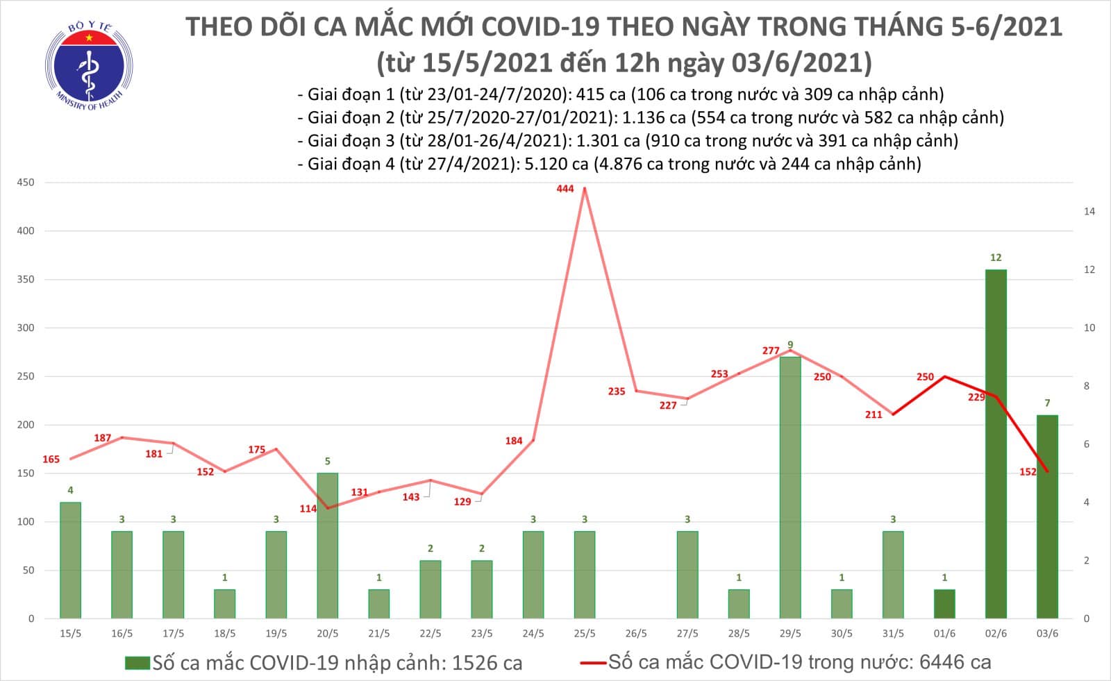 Tính đến 12 giờ ngày 3/6, Việt Nam có tổng cộng 6.446 ca mắc COVID-19 do lây nhiễm trong nước, trong đó số lượng ca mắc mới tính từ ngày 27/4 đến nay là 4.876 ca.