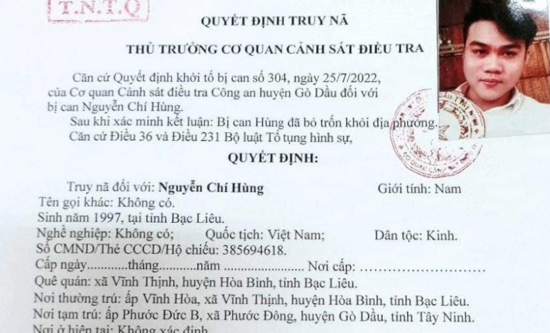 Chiều 15/11, Cơ quan CSĐT Công an huyện Gò Dầu (Tây Ninh) cho biết, đã ra quyết định truy nã toàn quốc đối với Nguyễn Chí Hùng (SN 1997, ngụ xã Vĩnh Thịnh, huyện Hòa Bình, Bạc Liêu) về hành vi cố ý gây thương tích.