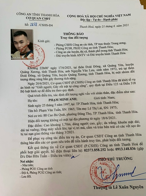 CQĐT Công an tỉnh Thanh Hóa hôm 20/6 đã khởi tố vụ án Giết người, Gây rối trật tự công cộng và ra thông báo truy tìm 3 nghi can liên quan vụ việc ông Nguyễn Văn L. (SN 1972), trú thôn Đoài Đông, xã Quảng Yên, huyện Quảng Xương bị bắn trọng thương.