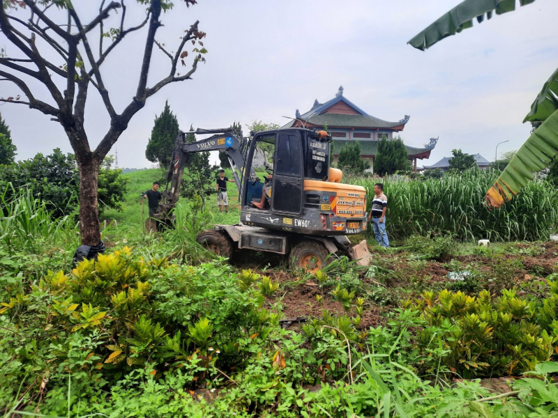 Hữu Bằng Resort đưa máy móc san gạt, di chuyển cây cảnh trả lại đất làm đường giao thông.