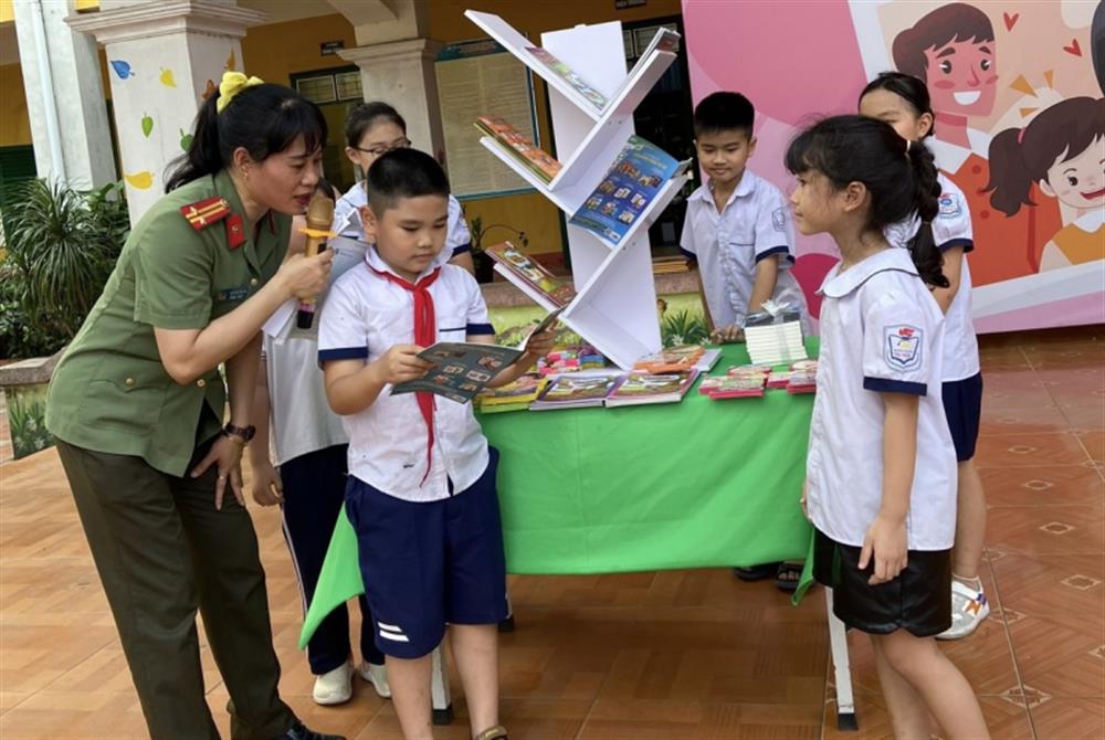 Cán bộ Trường Cao đẳng ANND I tuyên truyền về phòng chống bạo lực học đường cho học sinh Trường Tiểu học thị trấn Sóc Sơn.