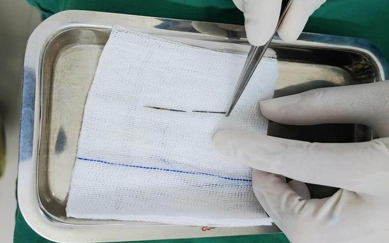 Dị vật kim khâu được lấy ra khỏi phổi bệnh nhi. Ảnh: BV.