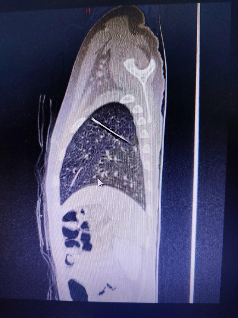 Tại đây, bệnh nhi được thăm khám và tiếp tục được chụp CT scan, ghi nhận dị vật hình dạng kim may áo quần, nằm trong nhu mô phổi trái, xuyên từ thùy dưới lên thùy trên.