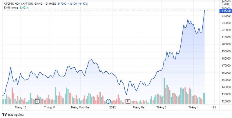 Đà tăng của DGC bắt đầu từ cuối tháng 3/2020, khi giá cổ phiếu còn dao động quanh vùng 15.000 đồng/cổ phiếu. Với thị giá cổ phiếu hiện tại, DGC tăng gấp 16 lần so với thời điểm đó. Tính riêng trong một năm trở lại đây thì cổ phiếu này đã tăng 315%.