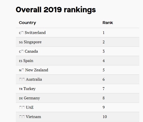 Bảng xếp hạng top 10 quốc gia đáng sống và làm việc nhất với người nước ngoài năm 2019.
