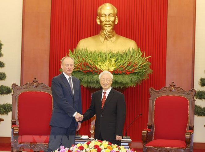Tổng Bí thư, Chủ tịch nước Nguyễn Phú Trọng tiếp Đại tướng Nikolai Patrushev, Thư ký Hội đồng An ninh Liên bang Nga. Ảnh: Trí Dũng/TTXVN