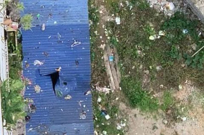 Hiện trường nơi nam thanh niên rơi xuống, làm thủng mái tôn và tử vong tại chỗ.