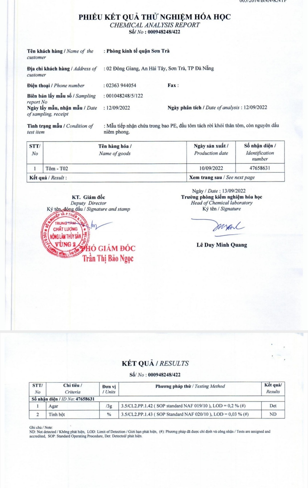Trung tâm Chất lượng Nông lâm thủy sản vùng II sau đó đã có thông báo kết quả thử nghiệm. Cụ thể, mẫu tôm của người bán (ký hiệu T-01) không phát hiện tạp chất tinh bột và Agar, còn mẫu tôm của người mua (ký hiệuT-02) có phát hiện tạp chất Agar.