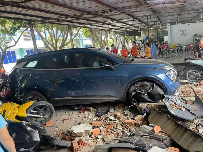 Tại hiện trường, bà G được người dân đưa vào bệnh viện cấp cứu. Phía sau bức tường bị sập là bãi giữ xe gắn máy. Nhiều xe máy đang đậu ở đây bị xe ô tô làm hư hỏng nặng.