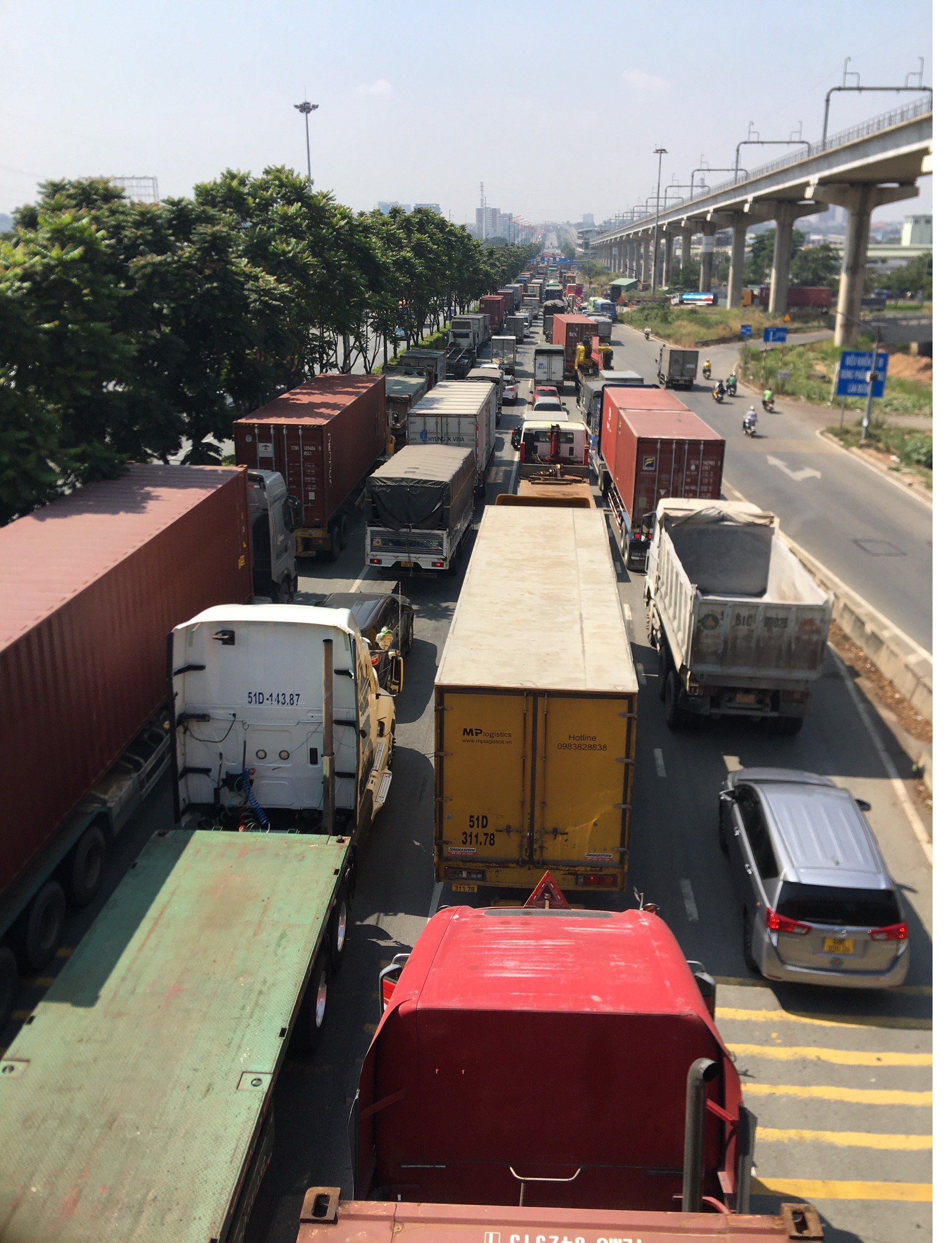 Nhiều tài xế cho hay, nguyên nhân việc kẹt xe kéo dài là do lượng xe container vào cảng Trường Thọ ngay ngã 4 MK quá đông khiến phương tiện buộc phải dồn ứ lại trên xa lộ Hà Nội.