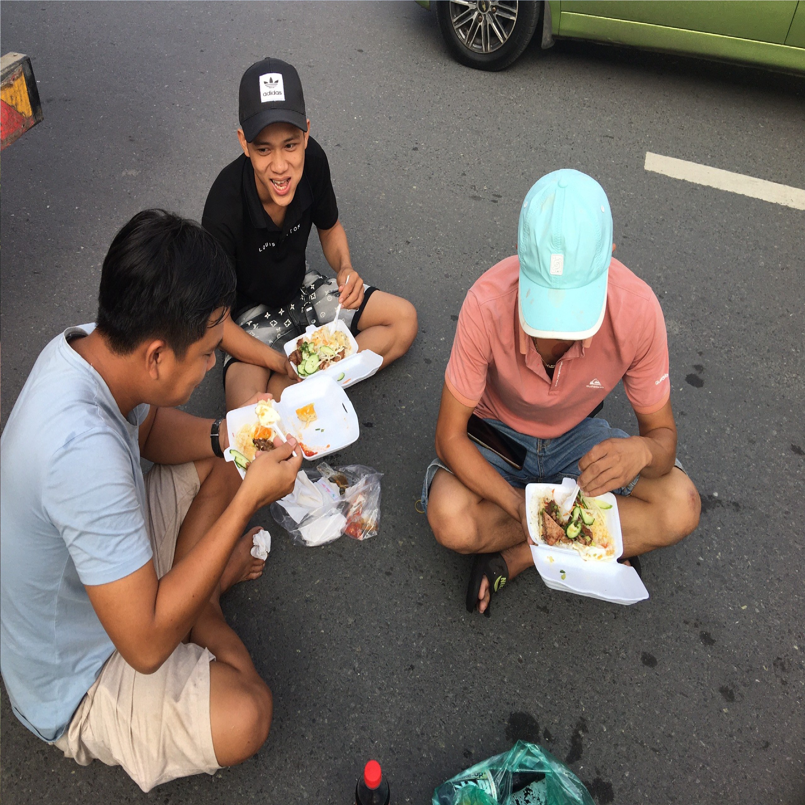 Kẹt xe quá lâu, phải “chôn chân” một chỗ hàng tiếng đồng hồ, nhiều tài xế, phụ xe tranh thủ xuống dưới ăn trưa chống đói. Họ cho biết, hiện tại đang rất sốt ruột vì chậm thời gian giao hàng, nhưng tình thế bắt buộc, không thể làm khác hơn.