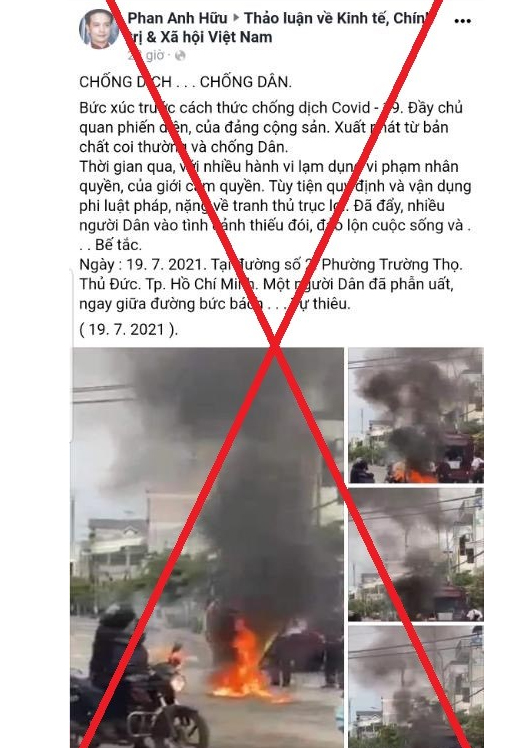 Đi kèm với lời bình là hình ảnh một người bị bốc cháy giữa đường. UBND phường Trường Thọ, đã bác bỏ thông tin sai sự thật trên.