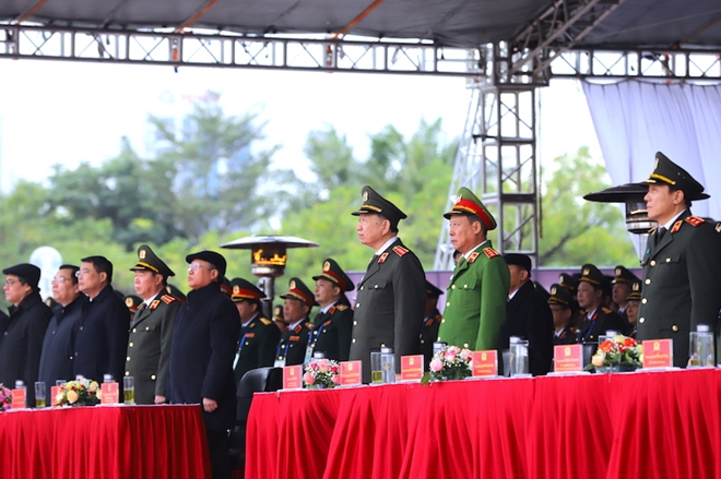 Thường trực Ban Bí thư Trần Quốc Vượng, Bộ trưởng Tô Lâm cùng các đại biểu tham dự Lễ xuất quân, diễn tập.
