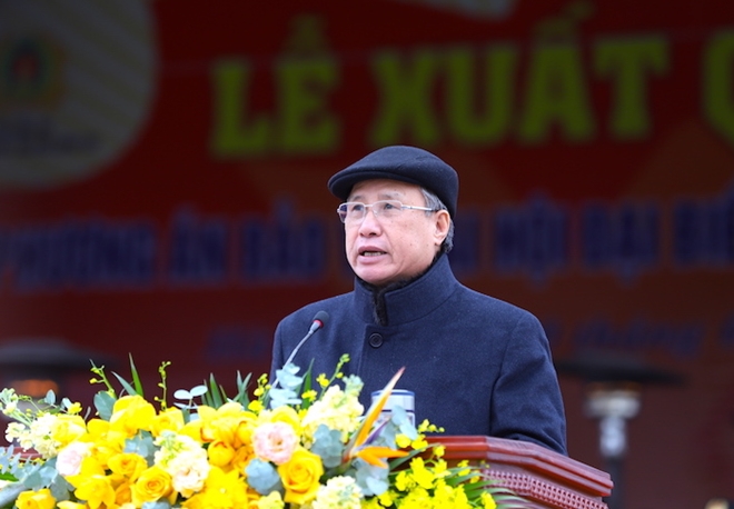 Tại Lễ xuất quân, Thượng tướng Bùi Văn Nam, Ủy viên Trung ương Đảng, Thứ trưởng Bộ Công an, Trưởng Tiểu ban An ninh, trật tự Đại hội XIII của Đảng báo cáo khái quát công tác chuẩn bị và triển khai công tác bảo đảm an ninh, trật tự phục vụ Đại hội XIII của Đảng.